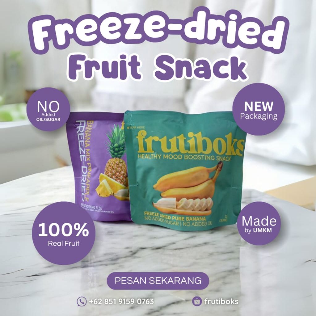 Frutiboks Freeze-dried Fruit Snack Keripik buah kering Berat: 25 gram ✅️ 100% buah asli ✅️ Tanpa tambahan gula ✅️ Tanpa tambahan minyak ✅️ Tanpa bahan pengawet ✅️ Vegan & diet friendly ✅️ Buatan UMKM Indonesia Frutiboks 'Freeze-dried snack' tersedia varian • BANANA (Pisang) • BANANA MIX PINEAPPLE (Pisang dan Nanas)